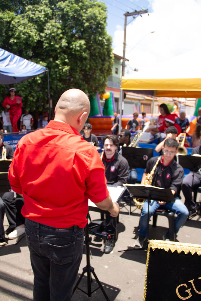 Sob a regência do maestro Jessé Francisco, os jovens músicos levaram alegria e musicalidade ao público presente, contribuindo para um ambiente festivo e acolhedor. A programação contou ainda com diversas atrações, como a presença do Homem-Aranha e do Papai Noel, que veio especialmente de Limeira/SP para participar da celebração.