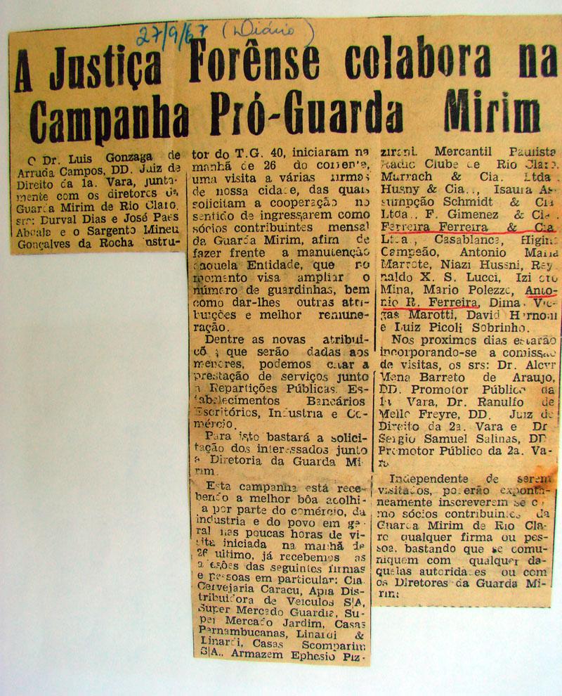 VEJA AS FOTOS A JUSTIÇA FORENSE COLABORA NA CAMPANHA PRÓ- GUARDA MIRIM Guarda Mirim 26/03/2010 DATA DA NOTICIA: 27.09.1967 Galeria de Imagens Clique nas imagens para ampliar a foto.