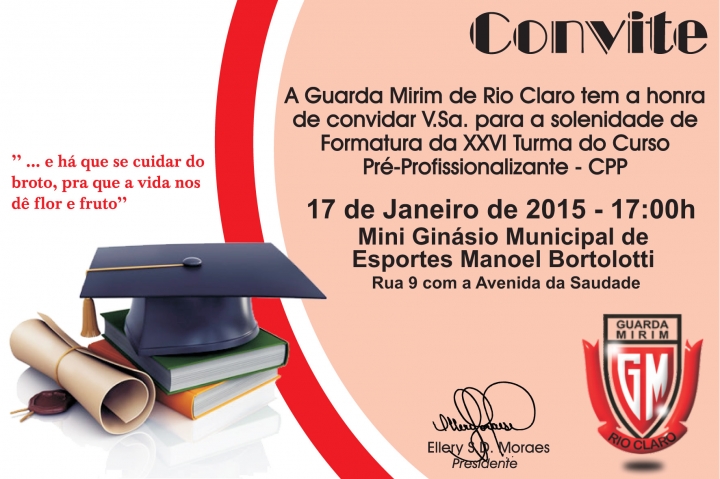 A Guarda Mirim de Rio Claro tem a honra de convidar V.Sa. para a solenidade de Formatura da 26ª Turma do Curso Pré-Profissionalizante - CPP.