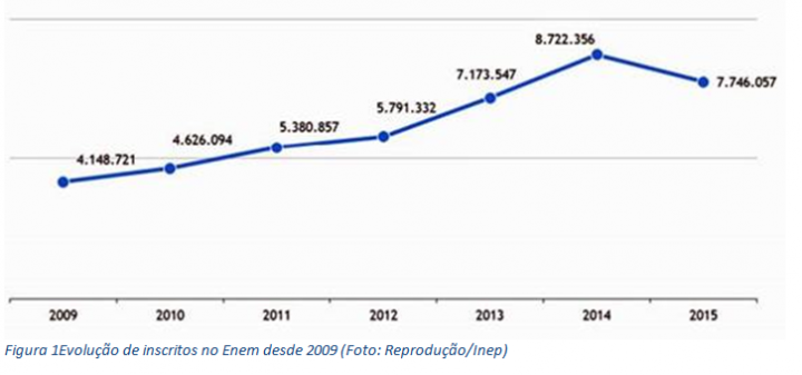 O Exame Nacional do Ensino Médio deste ano, está com 7.746.057 candidatos, um número 11% menor que no ano de 2014 - vejo no gráfico - e quebra uma sequência de recordes, vindouras desde 2008.