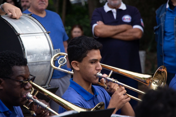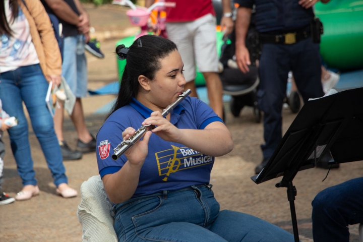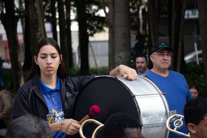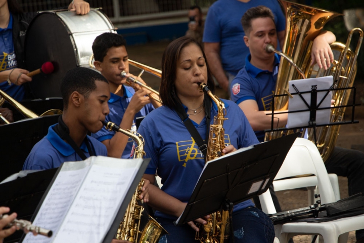 Sob a batuta do talentoso regente Jessé Francisco, a Banda Musical da Guarda Mirim brilhou ao se apresentar próximo ao coreto, em meio a uma atmosfera descontraída com food trucks e uma animada multidão. O espetáculo teve início pontualmente às 10h da manhã e durou aproximadamente uma hora, durante a qual os jovens músicos demonstraram seu talento e entusiasmo.
