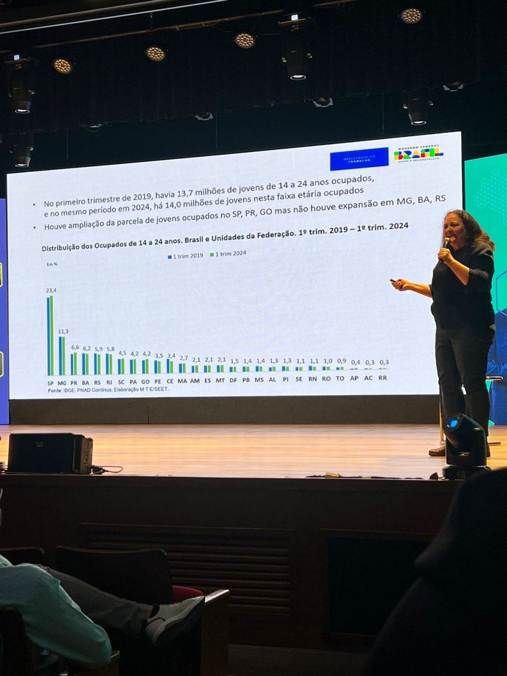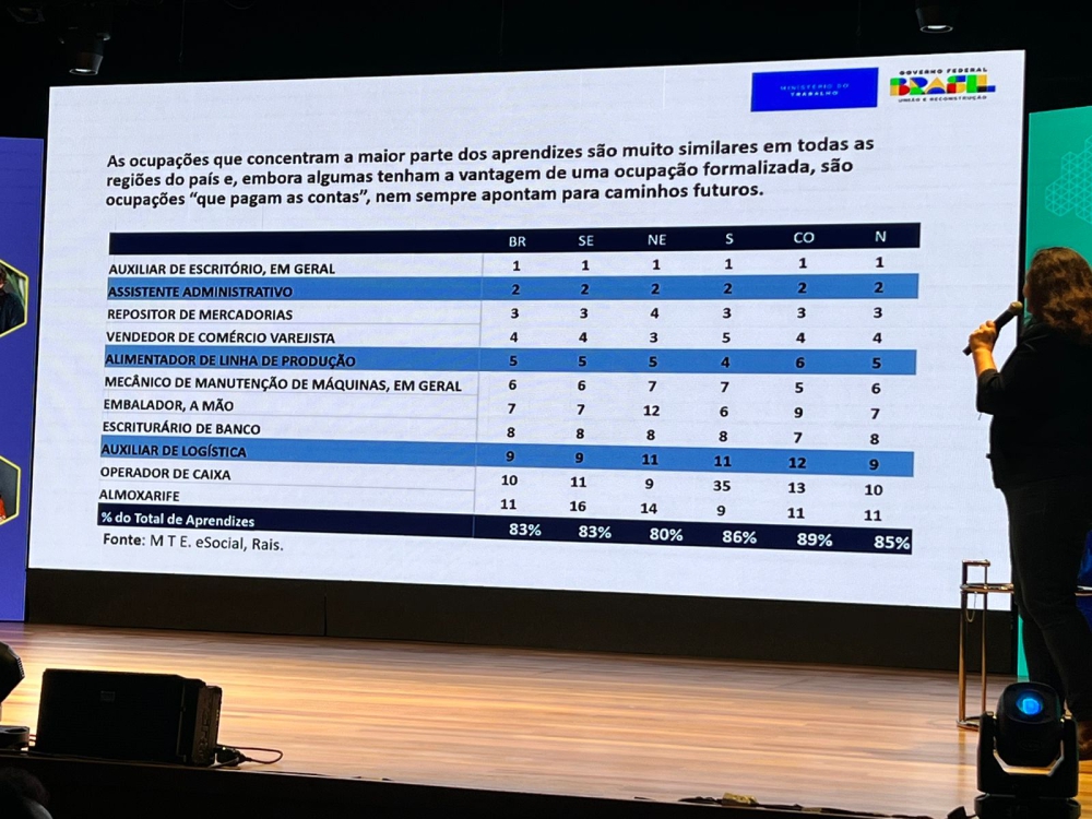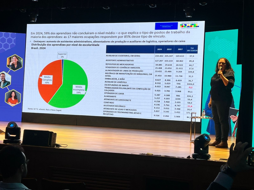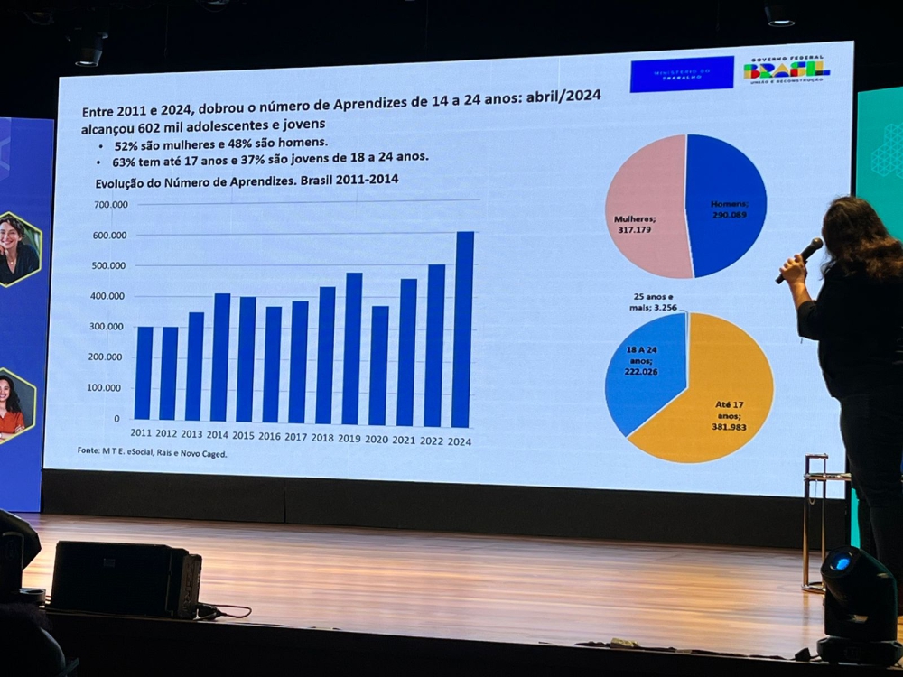 Foi apresentada uma pesquisa inédita feita pela Subsecretaria de Estatísticas e Estudos do Trabalho, do Ministério do Trabalho e Emprego (MTE), entre 2011 e 2024, onde dobrou o número de aprendizes no Brasil. Atualmente, são 602 mil. Já os estagiários eram 642 mil em 2023 e hoje são 877 mil, um crescimento de 37%. Mais da metade (51%) atua em empresas privadas, mas há elevada parcela no Setor Público (40%), principalmente na Administração Pública (30%) e Justiça (7%).