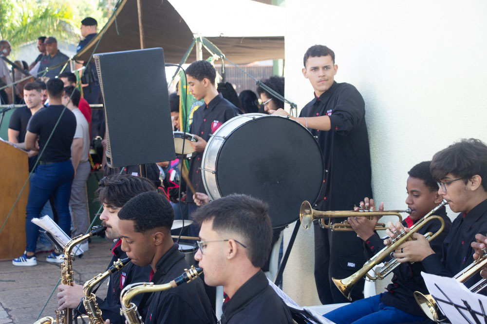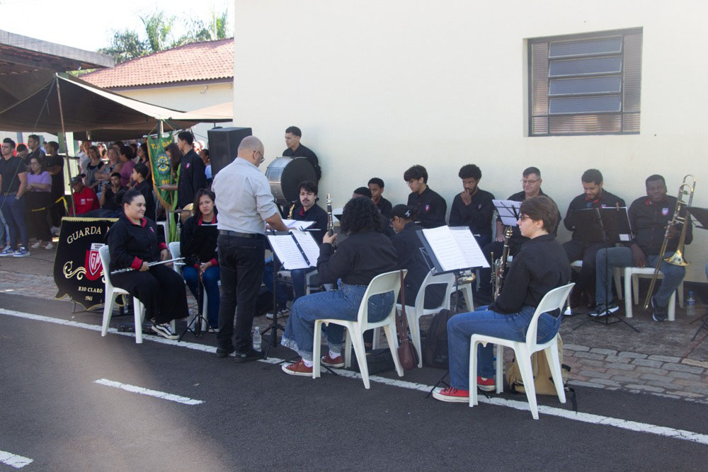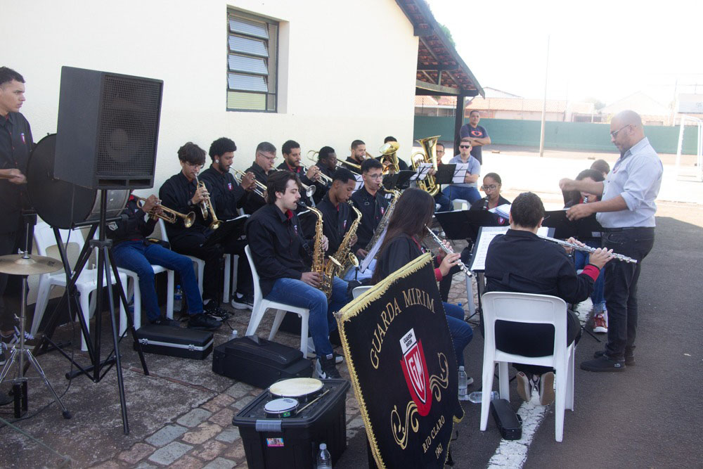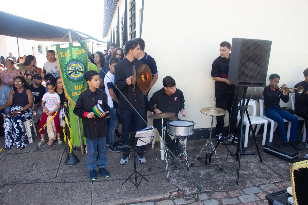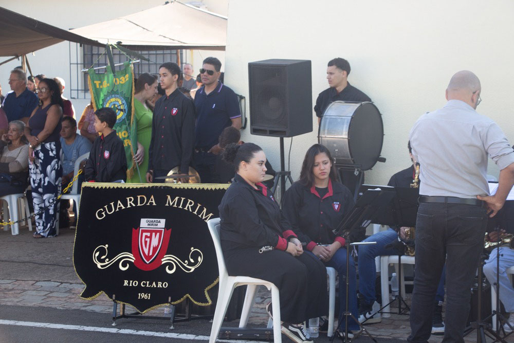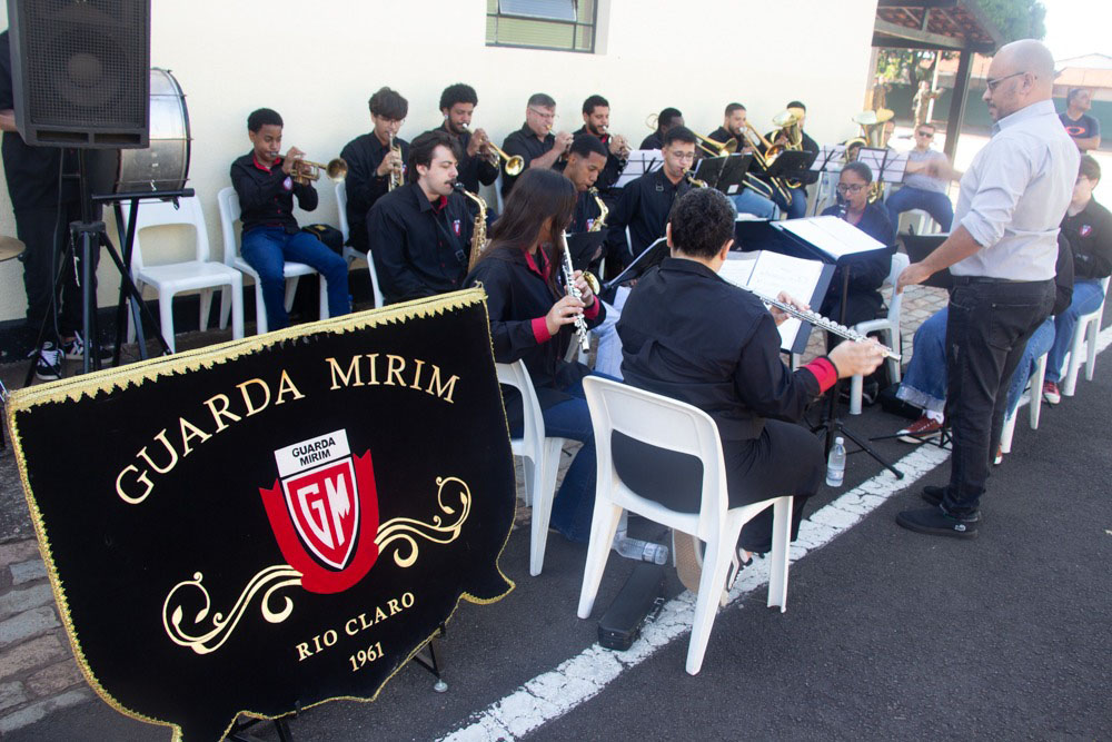 A banda executou Dobrados e o Hino Nacional Brasileiro, trazendo ainda mais solenidade e patriotismo ao evento. A participação do grupo reforça o compromisso da Guarda Mirim com a formação cívica e musical dos jovens da cidade.