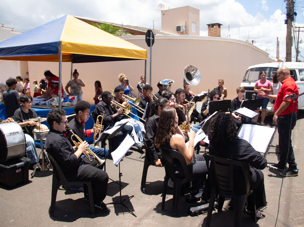 Sob a regência do maestro Jessé Francisco, os jovens músicos levaram alegria e musicalidade ao público presente, contribuindo para um ambiente festivo e acolhedor. A programação contou ainda com diversas atrações, como a presença do Homem-Aranha e do Papai Noel, que veio especialmente de Limeira/SP para participar da celebração.